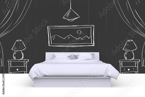 White Bed In Room With Hand Drawn Painted On Black Wall Big