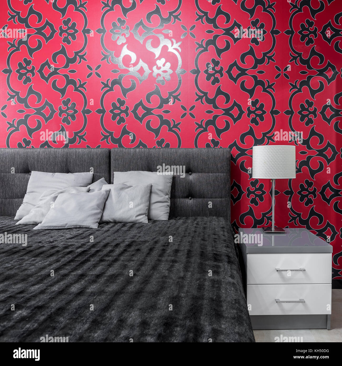 Cosy Bedroom With Big Bed And Patterned Black And Red Wall Stock
