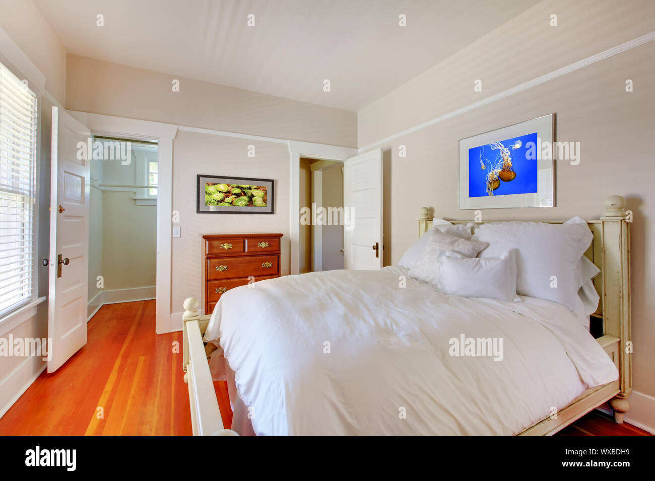 Bedroom With White Bed And Cherry Hardwood Floor Stock Photo