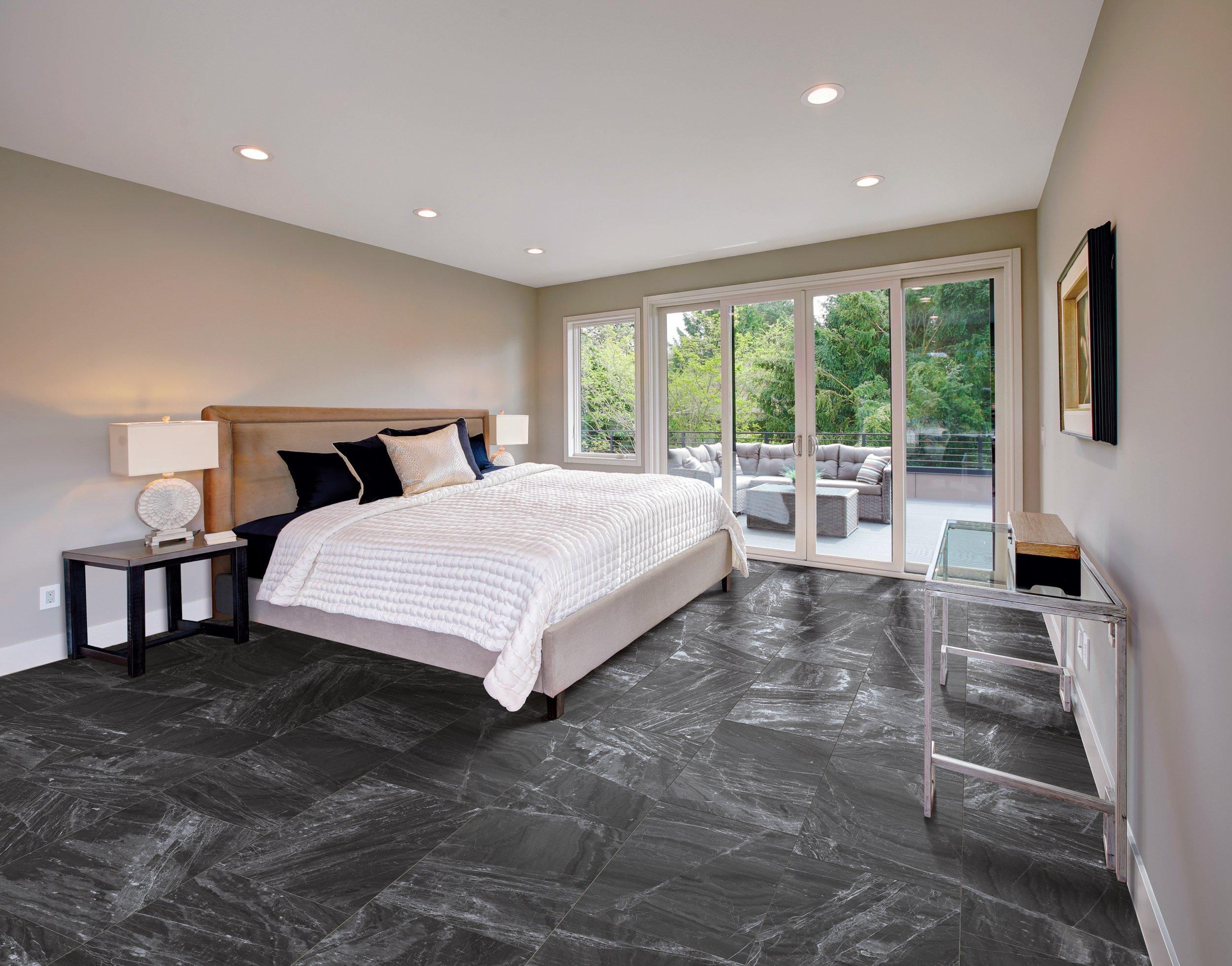 Black Marble Floors Add Luxury To This Bedroom Design Featuring